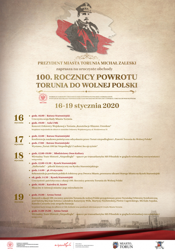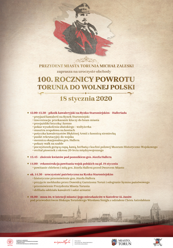 Z okazji 100. rocznicy powrotu Torunia do wolnej Polski przekazujemy informacje na temat uroczystości zaplanowanych dla mieszkańców. Zapraszamy do wzięcia udziału w propozycjach miejskich, w tym szczególnym dniu dla Torunia.