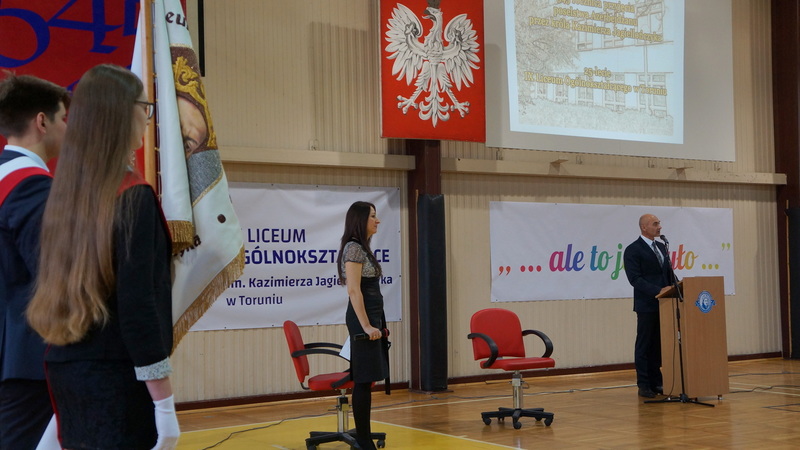 Prezydent Miasta Torunia, Pan Michał Zaleski, pogratulował jubileuszu i wręczył dyrektorowi szkoły prezent – sprzęt audio – przydatny podczas uroczystości szkolnych.