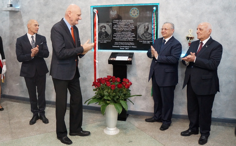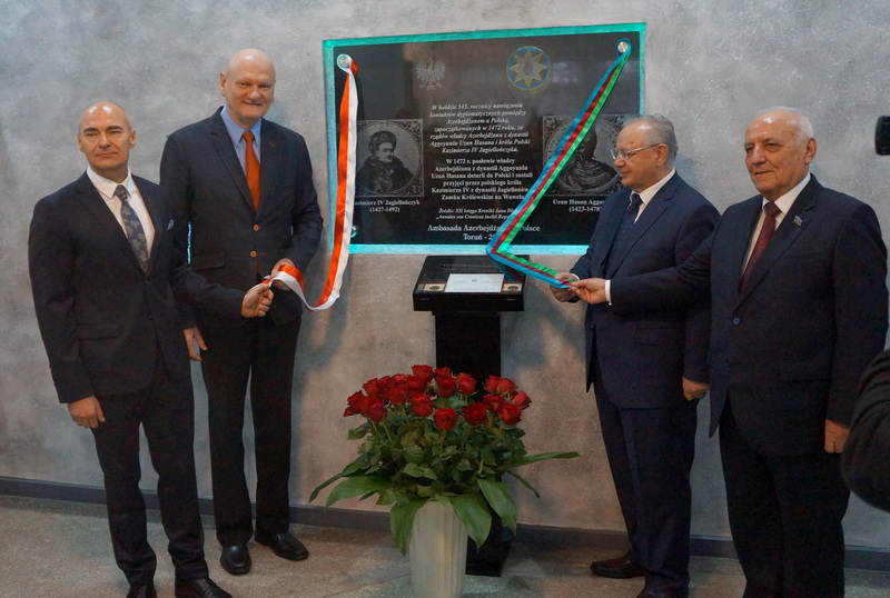 Pamiątkową tablicę, upamiętniającą spotkanie poselstwa Azerbejdżanu z królem Kazimierzem Jagiellończykiem, odsłonili Pan Ambasador Hasan Hasanow, Jakub Mahmudow – dyrektor Instytutu Historii Azerbejdżańskiej Akademii Nauk, Prezydent Miasta Torunia, Pan Michał Zaleski oraz nasz Dyrektor, Pan Piotr Drążkowski.