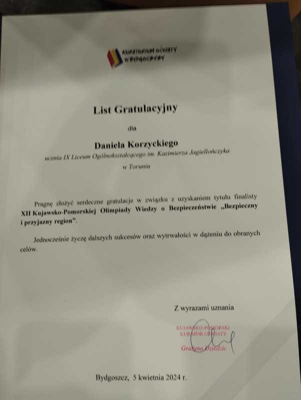 W finale XII. Kujawsko-Pomorskiej Olimpiady Wiedzy o Bezpieczeństwie 4️⃣ miejsce zdobył i otrzymał tytuł laureata nasz uczeń Daniel Korzycki!