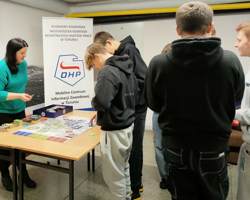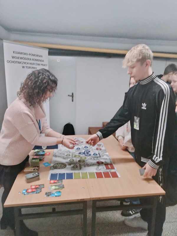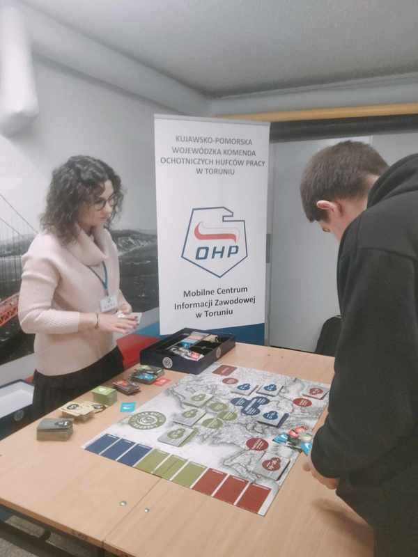 Dodamy jeszcze, że podczas naszego Dnia Nauk Matematyczno-Przyrodniczych gościła u nas Pani Joanna Pankowska - doradca zawodowy z Mobilnego Centrum Informacji Zawodowej w Toruniu, działającego w ramach Kujawsko-Pomorskiej Wojewódzkiej Komendy OHP w Toruniu. Pani Asia poza udostępnieniem nam gry ,,Chłopska Szkoła Biznesu" poinformowała młodzież z jakiego darmowego wsparcia mogą skorzystać w Centrum Edukacji i Pracy Młodzieży w Toruniu, czyli bezpłatne usługi doradców zawodowych, pośredników pracy i specjalistów ds. rozwoju zawodowego.