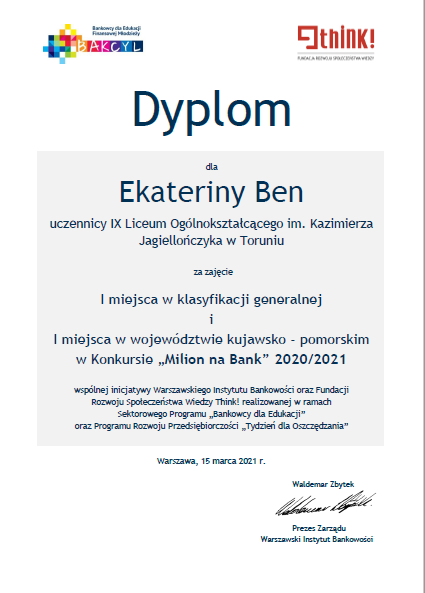 Kasia Ben z klasy 2d zwyciężyła w ogólnopolskim konkursie edukacyjnym Milion na Bank, którego celem jest między innymi podnoszenie kompetencji młodych ludzi w zakresie podstawowych narzędzi finansowych a także kształtowanie postawy przedsiębiorczości, upowszechnianie wiedzy na temat rynku kapitałowego i jego produktów, umiejętności inwestowania oraz zarządzania finansami osobistymi.