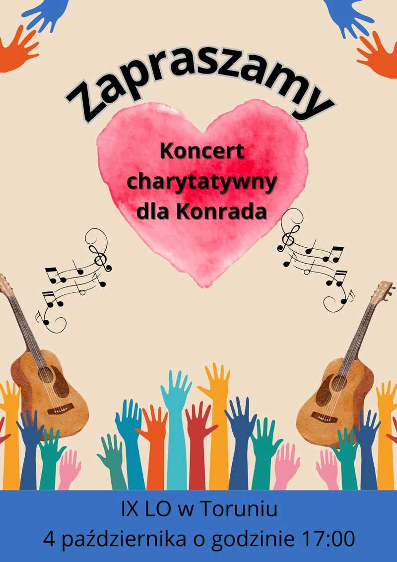 4 października, w piątek, w godzinach 17.00 – 20.00, odbędzie się Koncert charytatywny na rzecz ucznia naszej szkoły - Konrada z klasy IIIc, borykającego się z poważną chorobą.