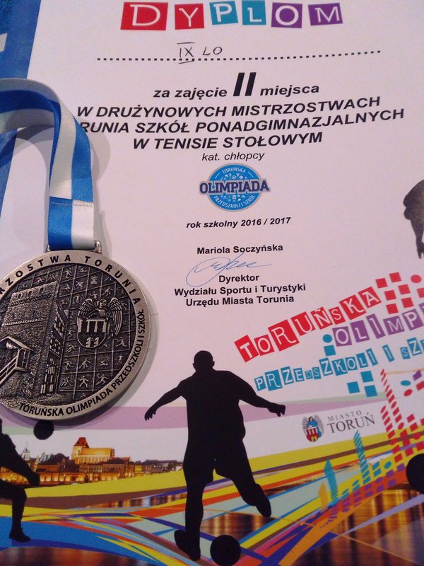 Reprezentacja IX Liceum Ogólnokształcącego wzięła udział w Mistrzostwach Torunia Szkół Ponadgimnazjalnych w tenisie stołowym. Drużyna chłopców odniosła wspaniały sukces, zajmując II miejsce i zdobywając tytuł wicemistrzów Torunia i srebrny medal w mistrzostwach. W zawodach wzięło udział 15 zespołów z toruńskich szkół średnich. W finale zawodów po zaciętej walce uczniowie IX LO ulegli drużynie ZSPS i VIII LO z wynikiem 2:3. Zespół IX LO wystąpił w składzie: Damian Węderlich III A, Szymon Cichocki II A i Patryk Bens II C.