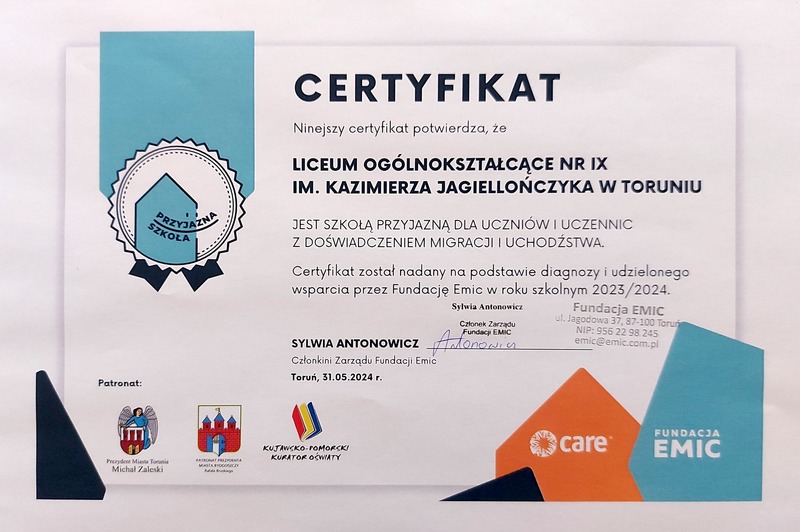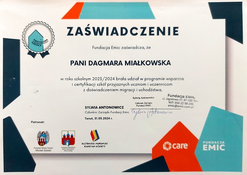 W ostatnim tygodniu szoły dotarła do nas wspaniała wiadomość, że nasza szkoła otrzymała certyfikat szkoły przyjaznej młodzieży z doświadczeniem migracji i uchodźstwa. Wraz z certyfikatem otrzymaliśmy zaświadczenie dla naszej pani pegagog Dagmary Miałkowskiej, która koordynowała w szkole wszelkie działania niezbędne do uzyskania niniejszego certyfikatu.
