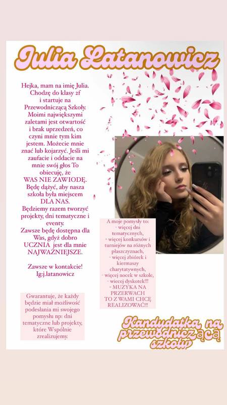 Julia Latanowicz jest kandydatką na Przewodniczącą Samorządu Uczniowskiego.