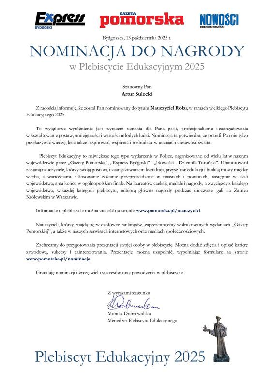 Przypominamy, że nasza szkoła walczy również o tytuł Szkoły Roku, a wcześniej nominację otrzymał pan Artur Sulecki.