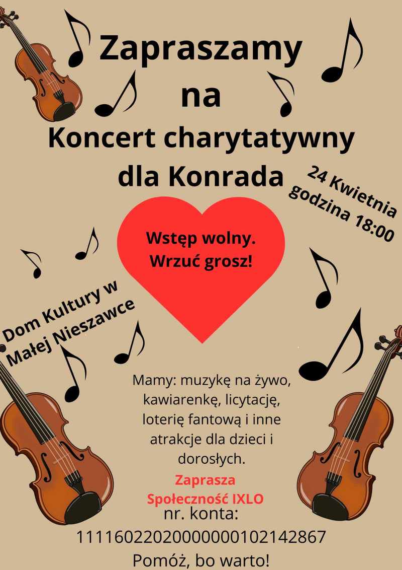 Zbiórka na leczenie Konrada, ucznia naszej szkoły. Dołącz do nas. Będzie muzyka na żywo, słodkości, loteria fantowa, licytacje wielu atrakcyjnych przedmiotów i usług. Zapraszamy całą społeczność szkolną, przyjaciół Dziewiątki i wszystkich ludzi, którzy mają ochotę z nami być. Dziękujemy za każdy grosz.