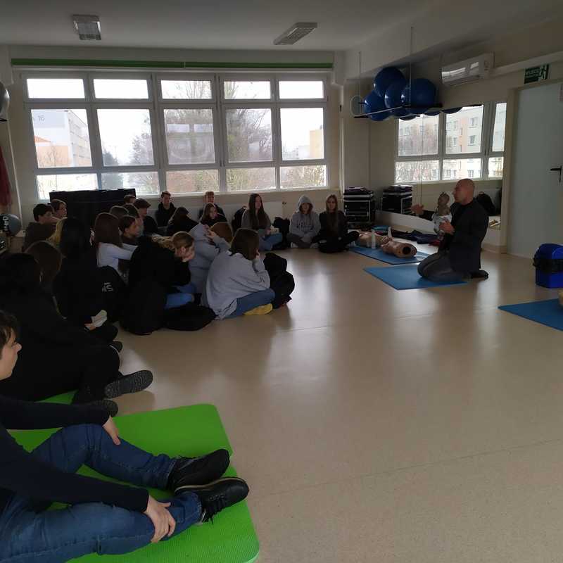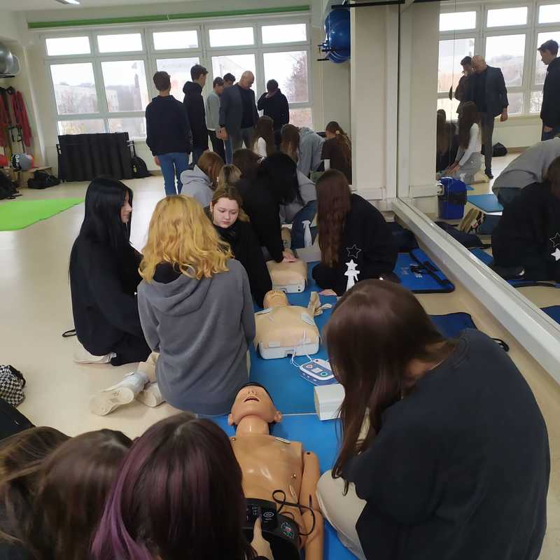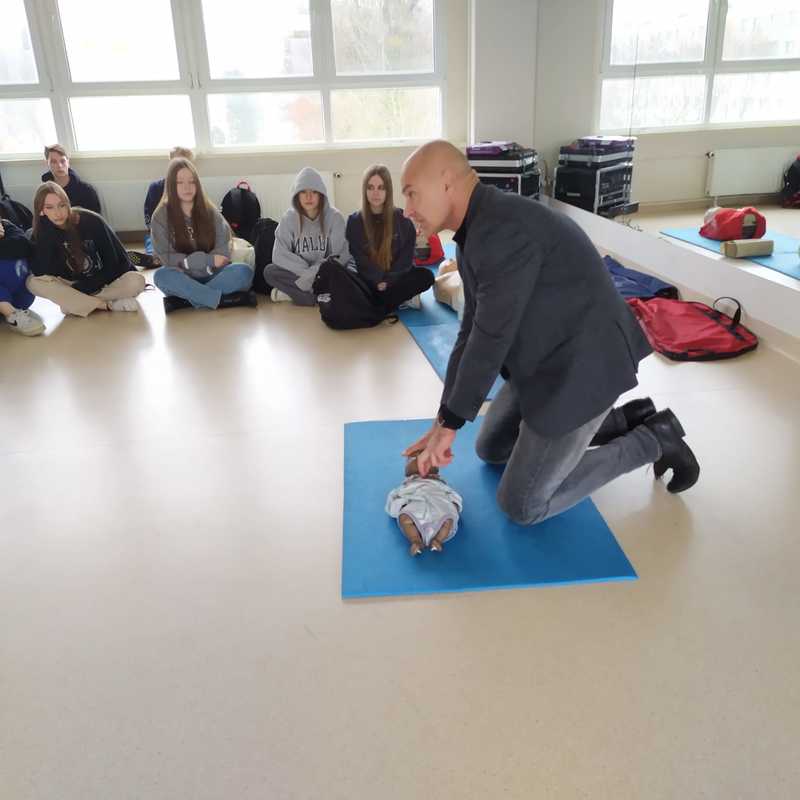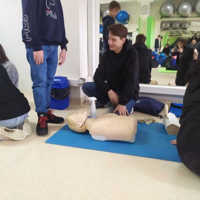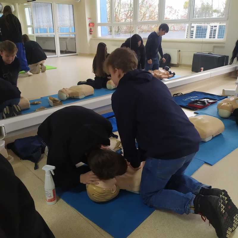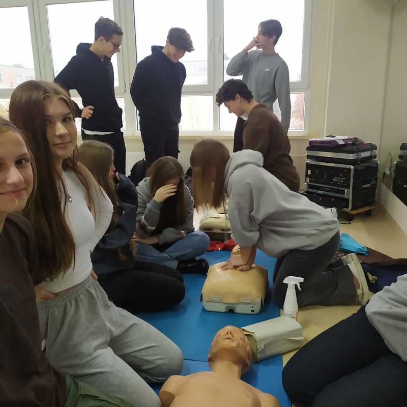Uczniowie klas pierwszych na lekcji p. Piotra Drążkowskiego ćwiczyli prawidłowe wykonanie samodzielnej resuscytacji krążeniowo-oddechowej (RKO) i z wykorzystaniem defibrylatora AED. Ważnym zadaniem było również nauczenie się układania poszkodowanego (z prawidłowym krążeniem) w pozycji bezpiecznej.