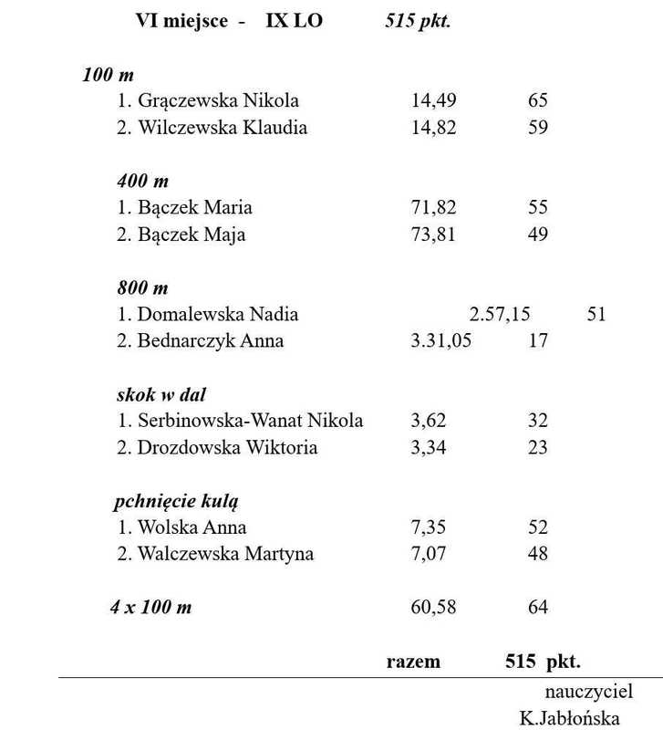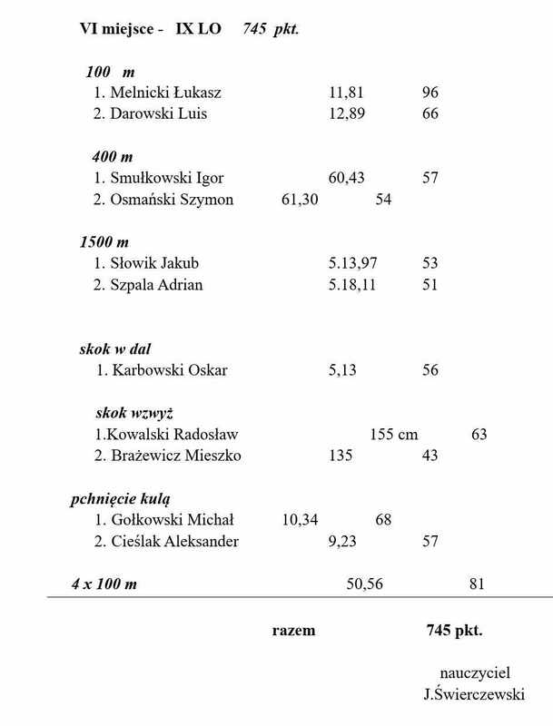 W dniu 4 października 2023 roku na Stadionie Miejskim im. Grzegorza Duneckiego w Toruniu odbył się I rzut drużynowych zawodów lekkoatletycznych szkół ponadpodstawowych rozegranych w ramach toruńskiej Licealiady. W zawodach tych wystartowali również uczniowie IX LO. Dziewczyny pod opieką pani Kamili Jabłońskiej wśród 16 drużyn zajęły VI miejsce i zdobyły 515 pkt. Najlepszy wynik indywidualnie osiągnęła Grączewska Nikola z klasy 1B osiągając na 100 metrów wynik 14,49 sek i uzyskując 65 pkt. dla drużyny. Chłopcy pod opieką pana Jaromira Świerczewskiego również zajęli VI miejsce w stawce 17 szkół toruńskich zdobywajac 771 pkt. Najlepiej z chłopców zaprezentował się Łukasz Melnicki z klasy 3B plasując się wynikiem 11,81 sek. na drugim miejscu wśród wszystkich uczestników w biegu na 100 metrów i zdobywając w ten sposób 96 pkt. dla IX LO. Drugi rzut szkolnych zawodów lekkoatletycznych zostanie rozegrany na wiosnę.