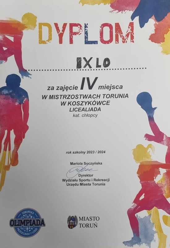 Uczniowie Dziewiątki wzięli udział w rozgrywkach o Mistrzostwo Torunia Szkół Ponadpodstawowych w piłce koszykowej chłopców rozegranych w ramach Toruńskiej Licealiady. W grupie eliminacyjnej nasz zespół pokonał Zespół Szkół Technicznych, Zespół Szkół Mechanicznych i Elektrycznych, III LO, ale doznał porażki z drużyną IV LO. Z drugiego miejsca awansował do rozgrywek finałowych i meczy o miejsca 4-6. W meczach tych nasi chłopcy wysoko wygrali z zespołami I LO i X LO , i zdobyli wysokie 4 miejsce w rozgrywkach wśród wszystkich toruńskich szkół ponadpodstawowych. Zespół IX LO wystąpił w składzie: Błaszczęć Jakub 2A, Ćwikliński Sebastian 2A, Lewandowski Jacek 2C, Kukułka Jan 3C, Mikołajczak Igor 3C, Dombrowicz Kajetan 1C, Brażewicz Mieszko 1C, Sobczyk Xavier 2A, Pilewski Jakub 1D, Maśliński Szymon 1A, Karbowski Oskar 1A i Poray Viktor 1G. Brawo!
