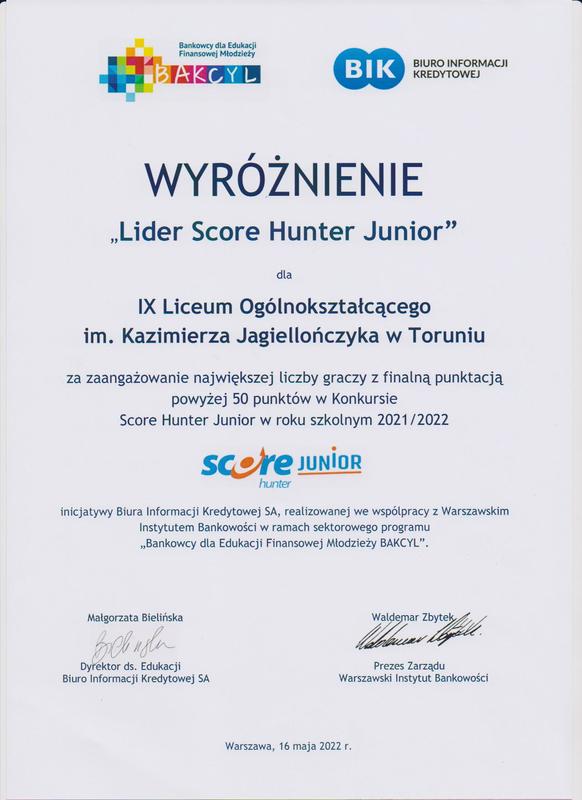 Wyróżnienie "Lider Score Huntrer Junor" dla IX Liceum Ogólnokształcącego im. Kazimierza Jagiellończyka w Toruniu za zaangażowanie największej liczby graczy finalną punktacją powyżej 50 punktów w konkursie Score Hunter Junior 2021/2022.