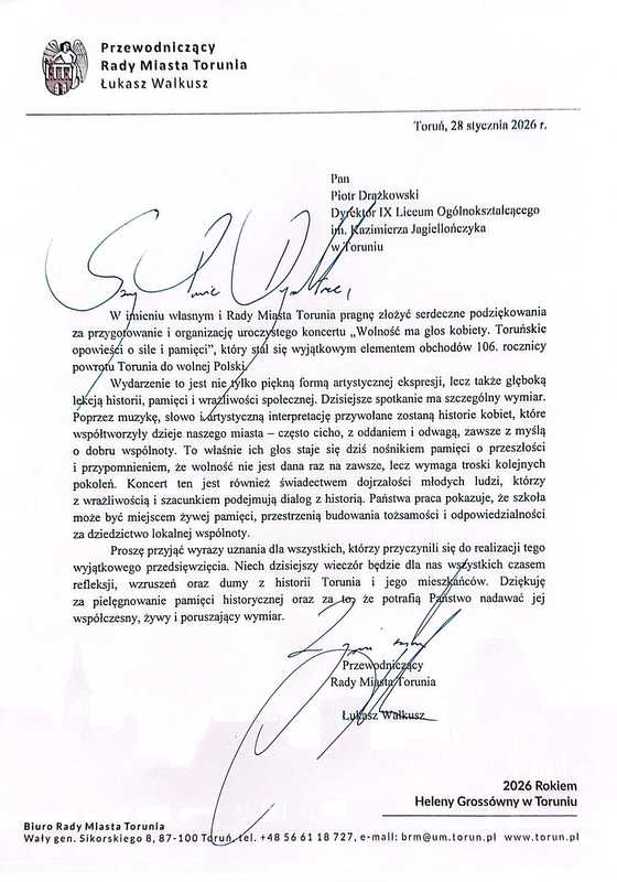 Nasza szkoła otrzymała list gratulacyjny od Przewodniczącego Rady Miasta Torunia, pana Łukasza Walkusza, z podziękowaniami za przygotowanie i organizację uroczystego koncertu „Wolność ma głos kobiety. Toruńskie opowieści o sile i pamięci”.