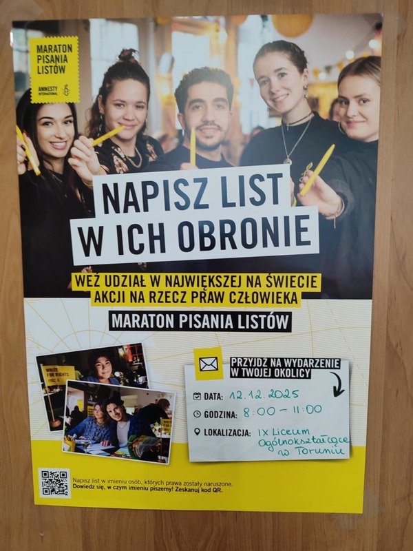 Dziś mury szkoły wypełniły się nie tylko dźwiękiem długopisów sunących po papierze, ale przede wszystkim empatią, odwagą i realnym działaniem. Odbył się u nas Maraton Pisania Listów organizowany przez Amnesty International – akcja, która pokazuje, że nawet z pozornie zwykłej szkolnej ławki można upomnieć się o prawa człowieka.