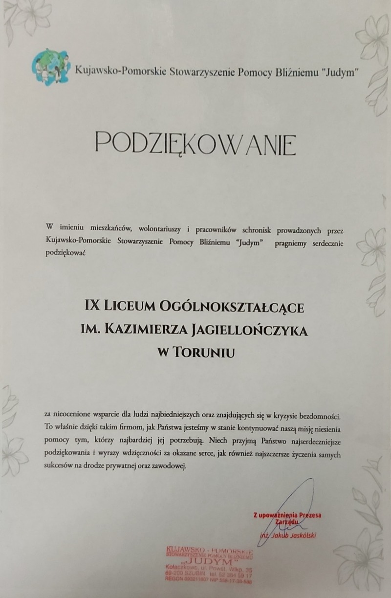 Dotarły do szkoły serdeczne podziękowania dla Wszystkich Członków społeczności szkoły, którzy włączyli się w akcję pomocową dla schronisk, w których to poszukują pomocy osoby w kryzysie bezdomności (prowadzone przez Kujawsko-Pomorskie Stowarzyszenie Pomocy Bliźniemu "Judym").