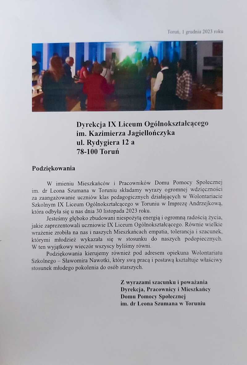 Podziękowania od DPS im. dr Leona Szumana w Toruniu
