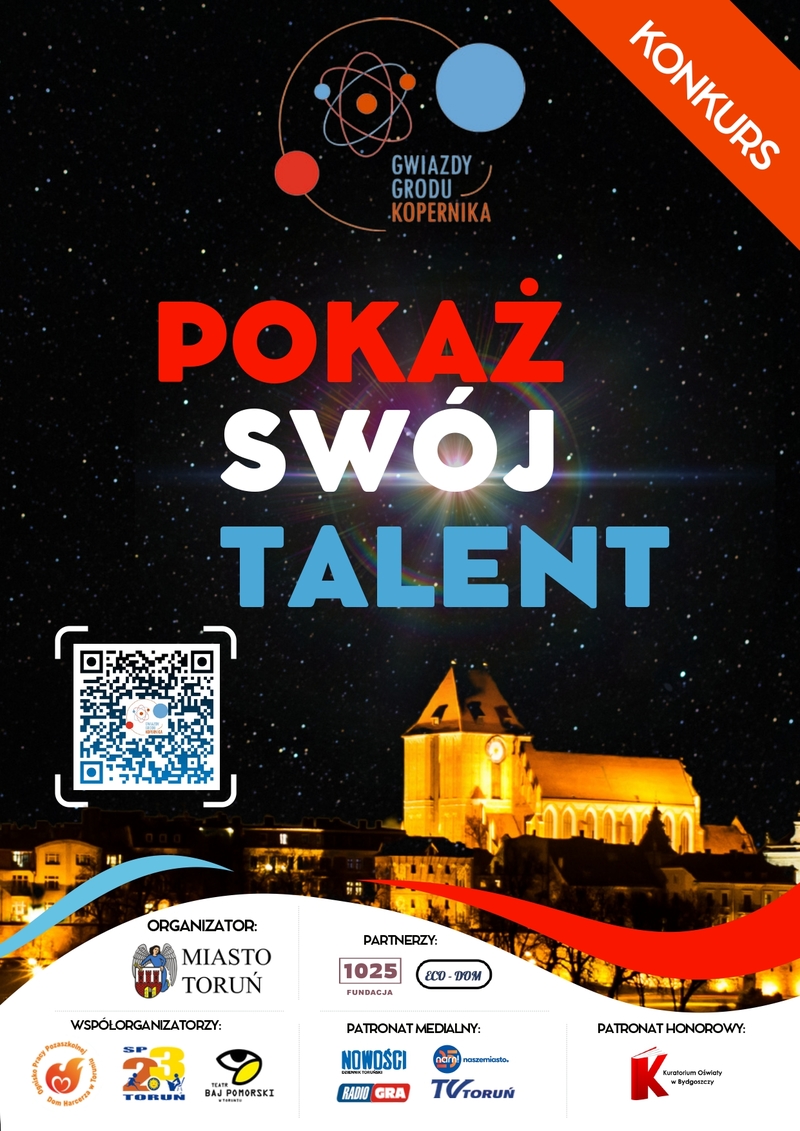 Strona konkursowa: https://sp23.torun.pl/home/gwiazdy-grodu-kopernika/ lub https://www.domharcerza.torun.pl/index.php/start/aktualnosci/606-iii-miejski-konkurs-pn-gwiazdy-grodu-kopernika-zgloszenia-dn-29-09-2025