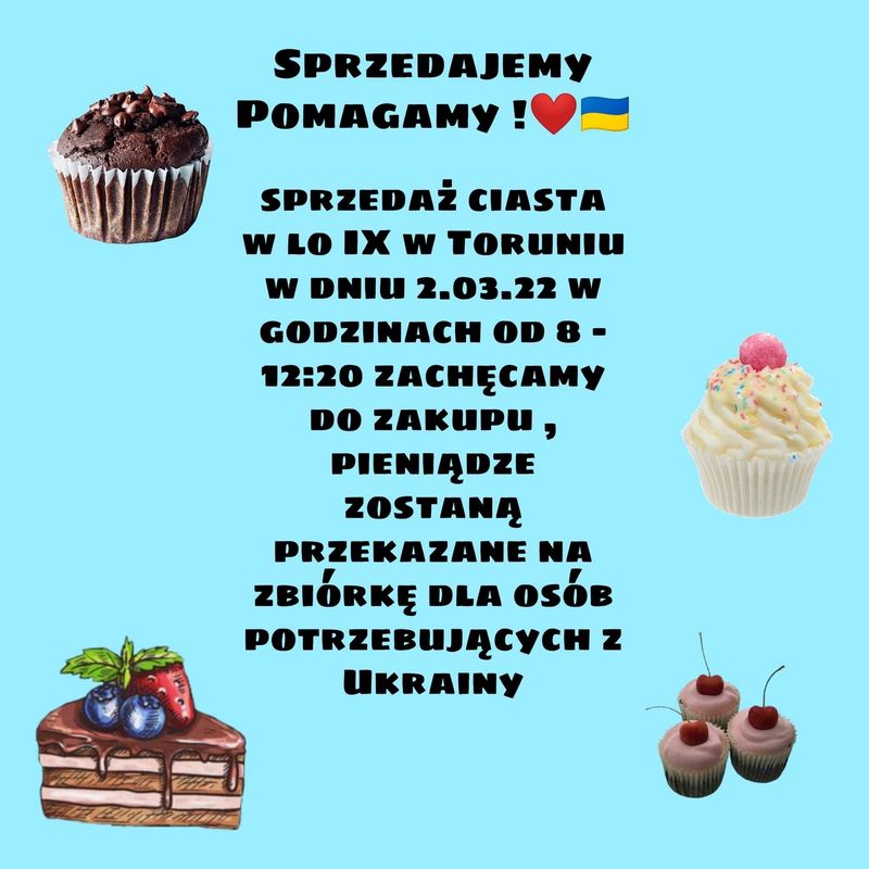 Sprzedajemy ciasta we wtorek 2-03-2022 r. od 8.00 do 12.20, a zebrane pieniądze przekażemy dla potrzebujących z Ukrainy