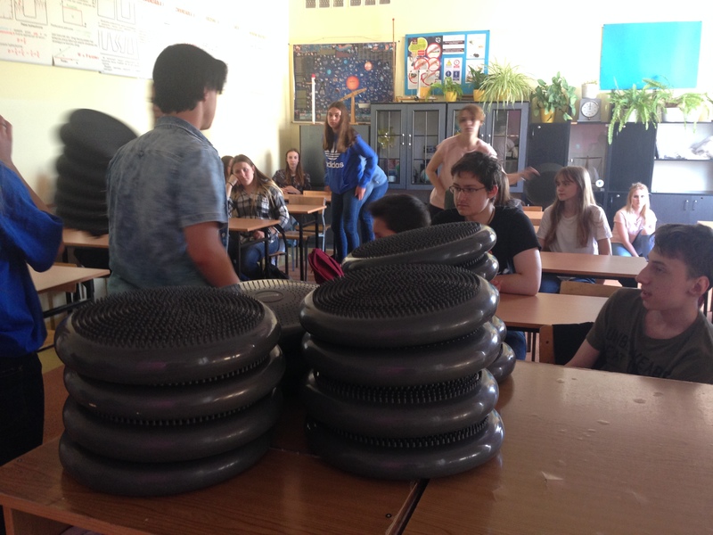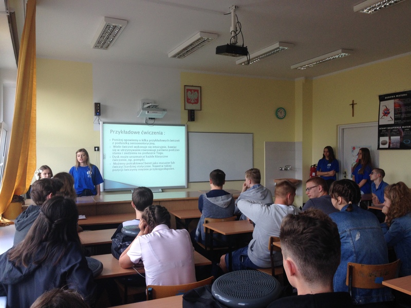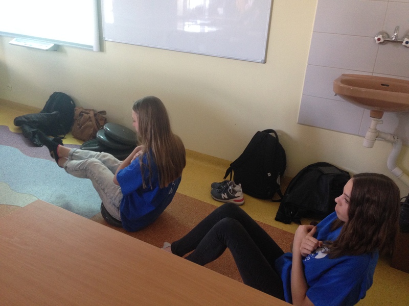 Klasa 2a po raz kolejny odwiedziła gimnazjalistów klas trzecich, tym razem w Gimnazjum 16. Dziewczęta przeprowadziły krótkie warsztaty aktywności ruchowej z wykorzystaniem dysków sensorycznych w warunkach trudnych czyli w salach lekcyjnych.