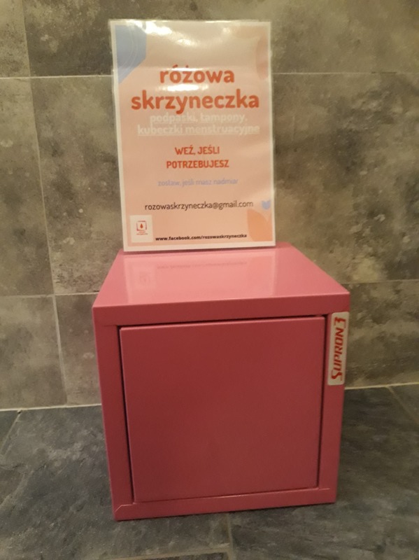 W naszej szkole pojawiła się mała różowa skrzyneczka. W ten sposób dołączyliśmy do ogólnopolskiej akcji zapobiegania wykluczeniu menstruacyjnemu. Zawiśnie w jednej ze szkolnych toalet. W środku znajdziecie podpaski, tampony i nawilżane chusteczki.