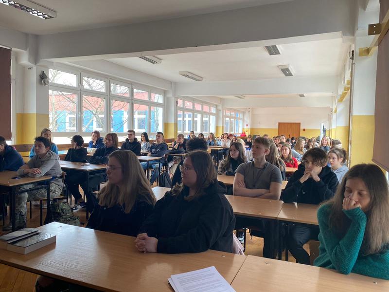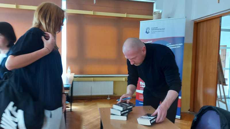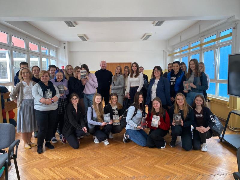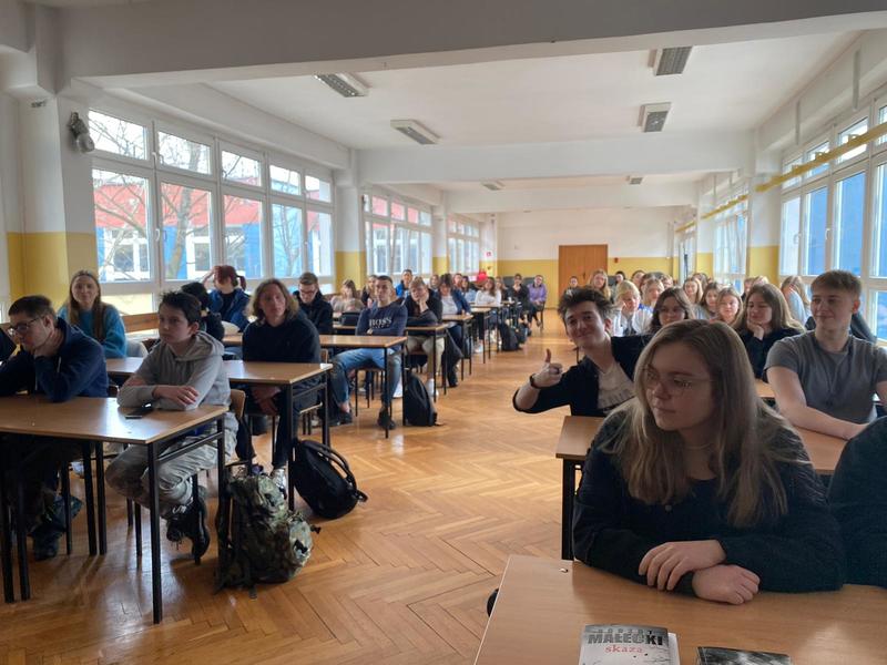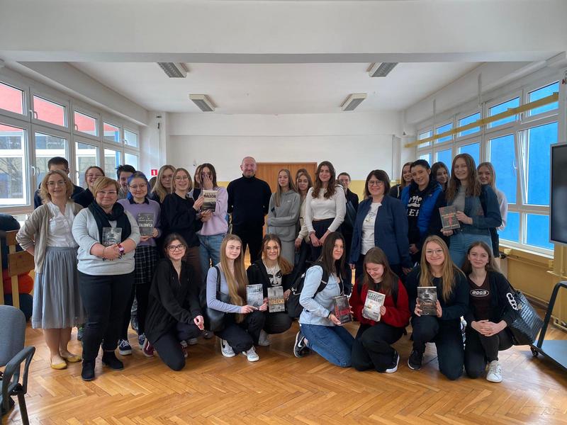 Wydarzenie odbyło się w sympatycznej atmosferze. P. Robert Małecki podzielił się z uczestnikami swoimi wspomnieniami z okresu szkoły średniej, informacjami o warsztacie pisarskim i wydanych publikacjach. Nasz gość wyczerpująco odpowiedział na wszystkie pytania uczniów. Na koniec serdecznie podziękowaliśmy p. Robertowi za przyjęcie naszego zaproszenia. Chętni uczestnicy otrzymali autografy autora.