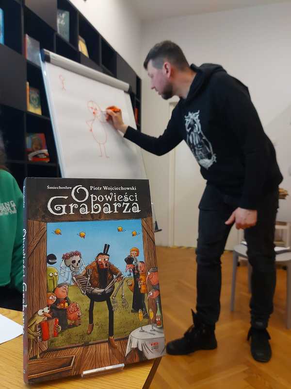To była niepowtarzalna okazja, by usłyszeć o tajnikach pracy artysty piszącego i rysującego komiksy, jak wygląda proces pisania i jakie emocje towarzyszą autorowi podczas tworzenia swoich dzieł. Śmiechosław odpowiedział nam również jak zaczynał swoją przygodę w świecie komiksów. Wśród licznych pytań od prowadzących i słuchaczy znalazły się również te o kultowe "Opowieści grabarza". Z ogromną przyjemnością wysłuchaliśmy spojlerów dotyczących kolejnych szykowanych tomików komiksowych, które to poruszy serca czytelników. Zwieńczeniem spotkania była krótka część warsztatowa podczas, której uczestnicy spotkania autorskiego mogli spróbować swoich sił w szkicowaniu postaci komiksowej. Na sam koniec nie zabrakło długiej kolejki po fantastycznie narysowane autografy!