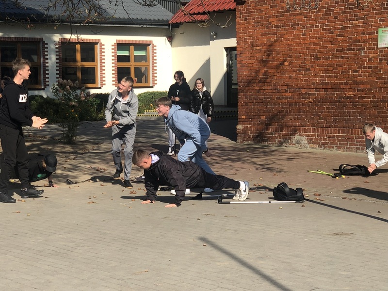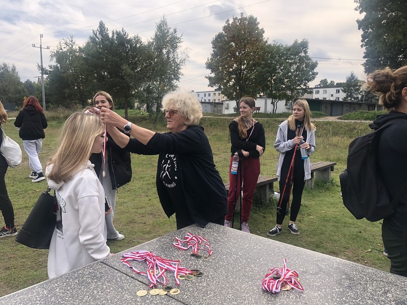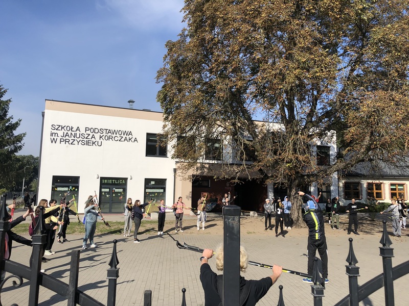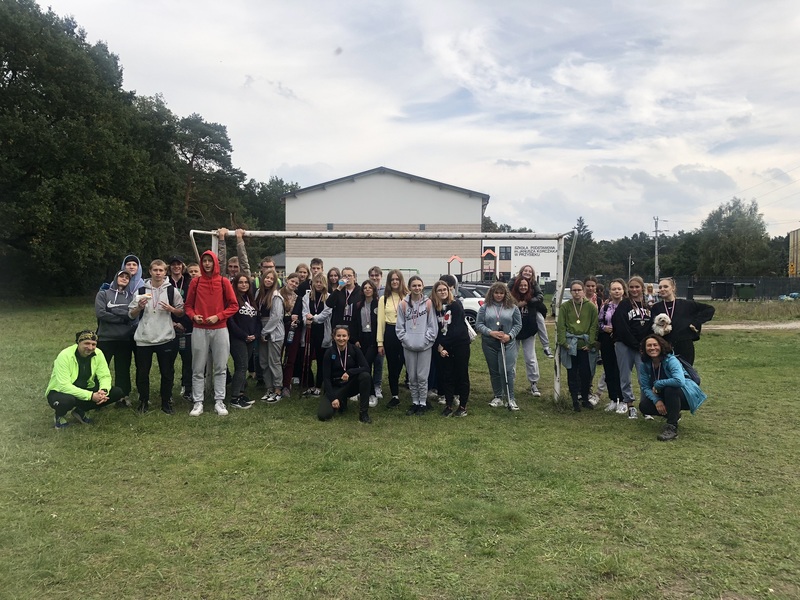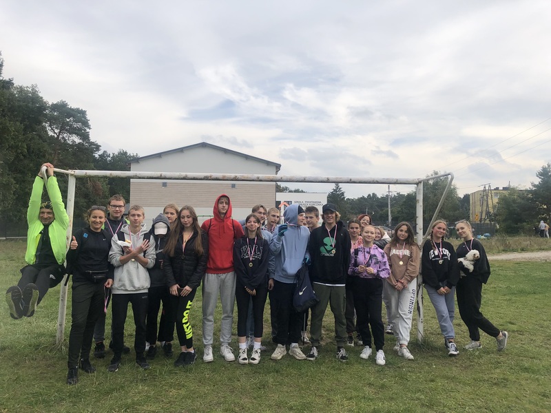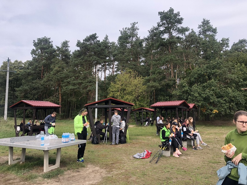 Nasza 45-osobowa grupa rozpoczęła aktywność rozgrzewką na boisku Szkoły Podstawowej, potem 5 km marszu w lesie z kijami Nordic Walking, powrót na teren zielony przy szkole, posiłek, medale, zdjęcia.