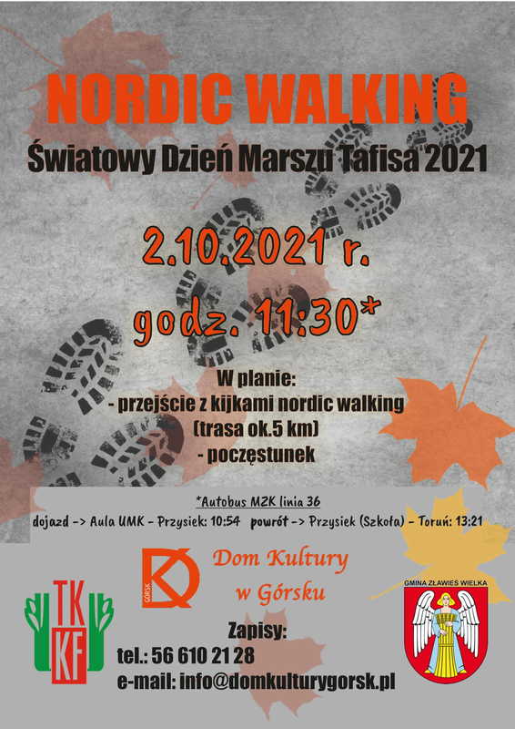 Nauczyciele WF zapraszają wszystkich chętnych do wspólnego marszu z okazji obchodów Światowego Dnia Marszu. Jak co roku - będzie marsz Nordic Walking, poczęstunek, certyfikaty uczestnictwa, medale, dużo uśmiechu... zaliczone godziny WF inna forma... Zaproście do wspólnej aktywności swoich rodziców..
