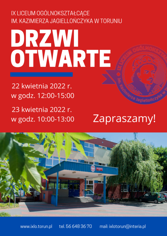 Informujemy, że Drzwi Otwarte w IX Liceum Ogólnokształcącym w Toruniu odbędą się w dniach 22-23 kwietnia 2022 r.