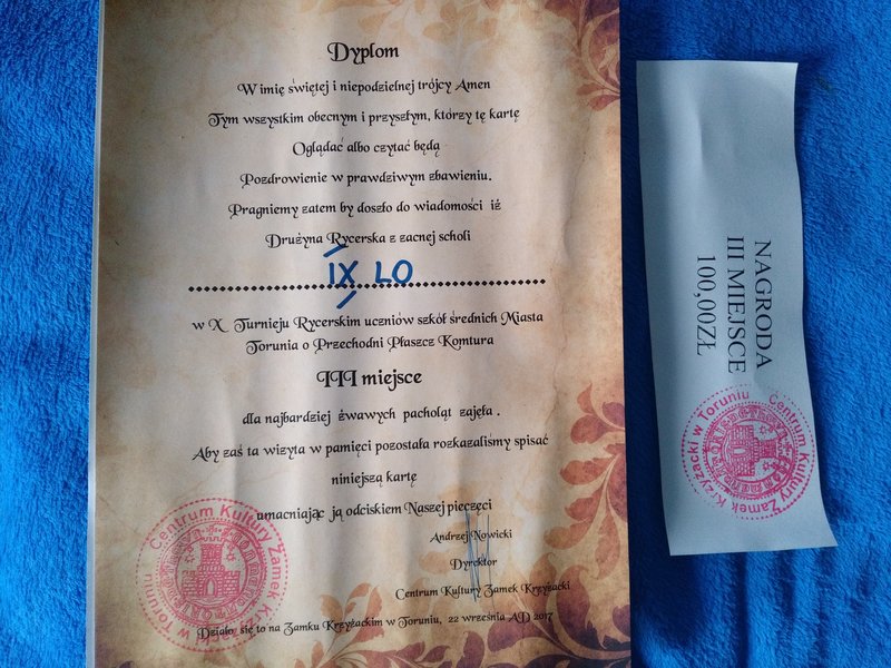 Reprezentacja IX Liceum Ogólnokształcącego im. Kazimierza Jagiellończyka wzięła udział w IX Średniowiecznym Turnieju Rycerskim uczniów szkół średnich miasta Torunia. Drużyna rycerska naszej szkoły zajęła III miejsce w klasyfikacji ogólnej, wygrywając drużynowo dwie konkurencje: rzut nożem i przeciąganie liny. Ponadto rozegrano konkurencje : rzut toporem, strzelanie z łuku i bieg zamkowy na jedno okrążenie ruin zamku. Sukcesy indywidualne odnieśli: Radosław Blumkowski (klasa IIIC) II miejsce w rzucie nożem, Michał Tabaka (klasa IIC) III miejsce w rzucie toporem i Patryk Czachorowski (klasa IIIB) III miejsce w biegu zamkowym.