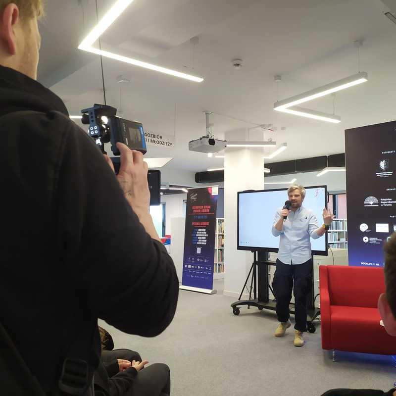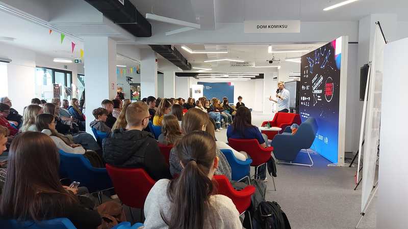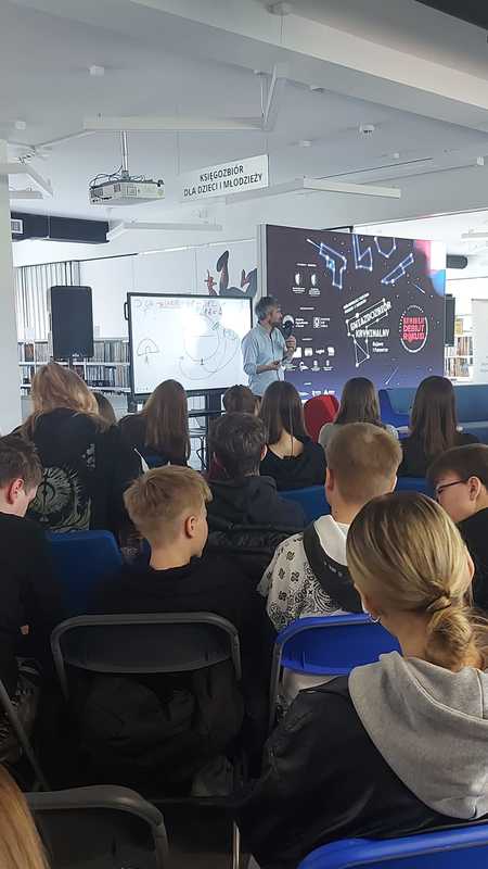 Wczoraj w Mediatece w Młynach Kultury prawie setka naszych uczniów uczestniczyła w spotkaniu warsztatowym z pisarzem Zygmuntem Miłoszewskim w ramach Ogólnopolskiego Festiwalu Premier i Debiutów Gwiazdozbiór Kryminalny. Zygmunt Miłosewski na kilku przykładach postaci historycznych i literackich (np. Shreka czy Froda Bagginsa) przedstawił uczniom schemat budowy fabuły mistrzowskich utworów. Uczniowie mieli okazję poznać p. Zygmunta i  jego bogatą twórczość. Nie zabrakło wspólnego zdjęcia oraz autografów.
