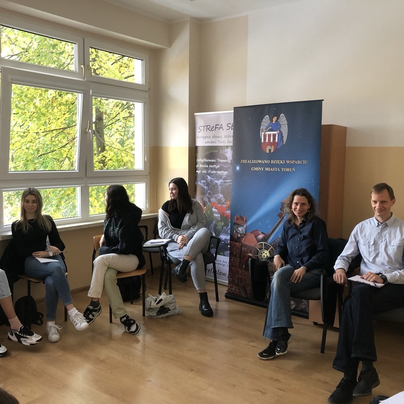 Za nami pierwszy dzień warsztatów profilowych dla klas IIa i IIIa. Warsztaty zorganizowane przy współpracy ze Stowarzyszeniem na rzecz dobrych praktyk „Patron”, dofinansowane przez Urząd Miasta Torunia. Dlatego też, przy realizacji zajęć korzystamy z doświadczonych specjalistów: certyfikowani trenerzy NVC (dr Beata Hołtyń, mgr Piotr Hołtyń), psychoterapeutka i prezes Stowarzyszenia „Patron” (mgr Danuta Gadziomska), specjalistka od wizażu (Patrycja Jenny).