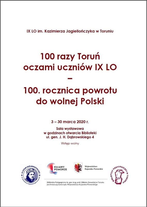 Wystawa „100 razy Toruń oczami uczniów IX LO – 100. rocznica powrotu do wolnej Polski” jest wynikiem szkolnego konkursu pt. „100 razy Toruń oczami uczniów IX LO”. Konkurs zorganizowały nauczycielki bibliotekarki z „dziewiątki” – Gabriela Gustowska i Jagoda Rycharska we współpracy ze Stowarzyszeniem Toruńskie Spacery Fotograficzne. To właśnie niezwykła wystawa „100 razy Toruń”, przygotowana w 2019 roku przez członków Stowarzyszenia, stanowiła bezpośrednią inspirację dla pomysłodawców stworzenia przeglądu prac szkolnych amatorów fotografii.