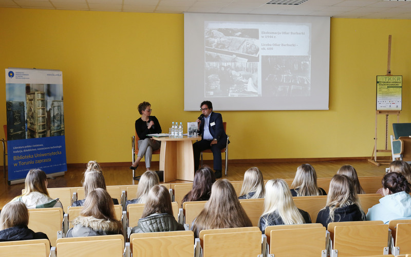 W poniedziałek 13 maja br. uczniowie klas IA i IIB wzięli udział w spotkaniach autorskich organizowanych przez Bibliotekę Uniwersytecką w Toruniu w ramach XVI Ogólnopolskiego Tygodnia Bibliotek. Na zdjęciu spotkanie promujące książkę prof. Sylwii Grochowiny i dr Katarzyny Kąckiej „Polityka niemieckich władz okupacyjnych na Pomorzu Gdańskim. Dokumentacja wybranych problemów” (Toruń 2018). Autor zdjęć Piotr Kurek