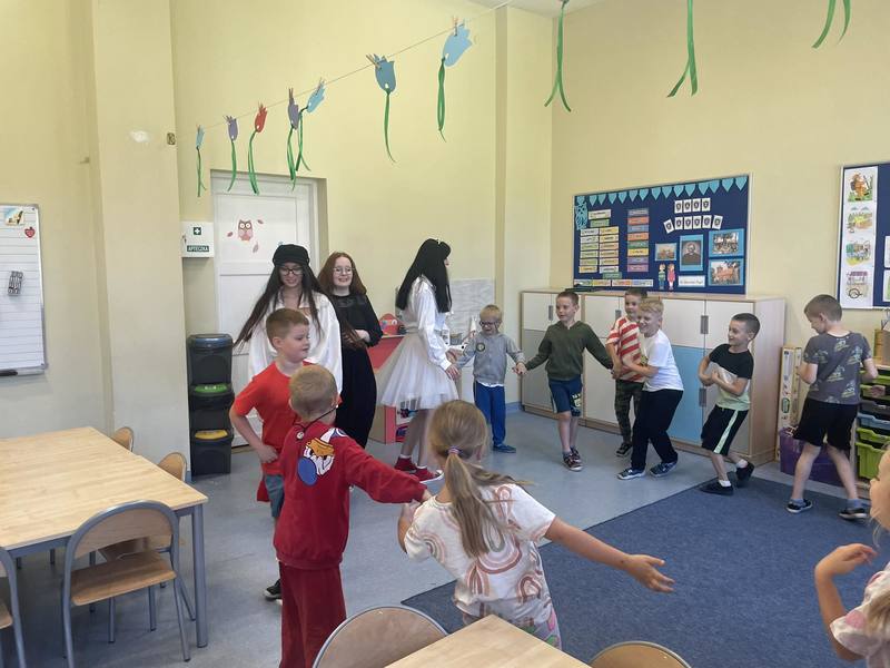 Uczennice klasy 3B w ramach projektu "Zwolnieni z teorii" odwiedziły uczniów klasy 0 i 1 Szkoły Podstawowej im. ks. Stanisława Kujota w Wybczu. W ramach swoich działań opowiedziały maluchom bajkę o przyjaźni, uczyły tańczyć, oraz dobyła się koronacja na rycerzy tańca, uczennice zostały zaproszone na kolejne spotkanie z uczniami.