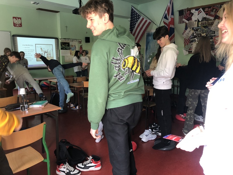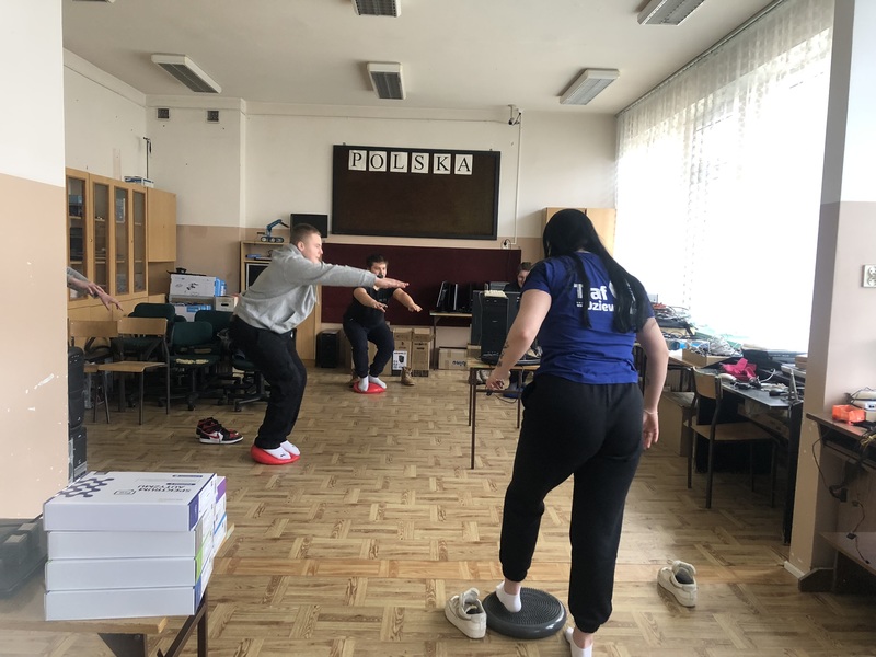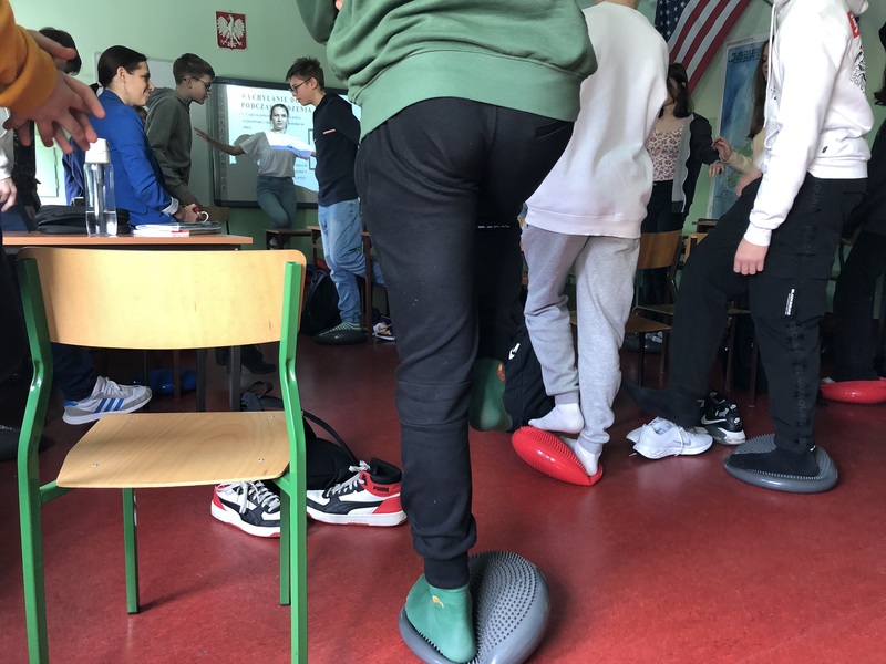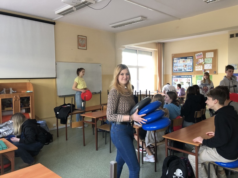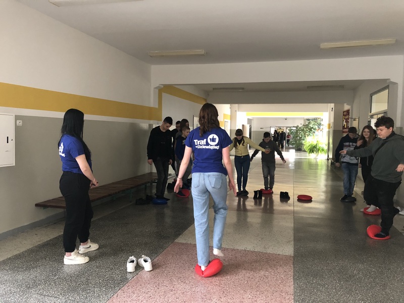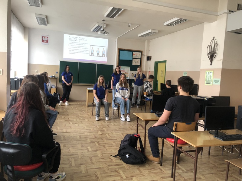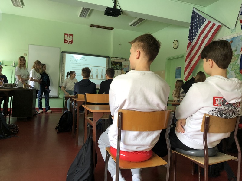 Uczennice klasy 3a (profil zdrowie i uroda) w trakcie realizacji projektu edukacyjnego. Odwiedzamy szkoły podstawowe w Toruniu i okolicach, prezentując prozdrowotne walory dysków sensomotorycznych.