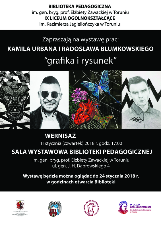W czwartek 11 stycznia o godz. 17:00 w sali wystawowej Biblioteki Pedagogicznej w Toruniu, odbył się wernisaż wystawy "Grafika i rysunek". Autorami prezentowanych prac plastycznych są uczniowie naszej szkoły Kamil Urban i Radosław Blumkowski z kl. 3C. Wszystkim, którzy wzięli udział w tym wydarzeniu kulturalnym serdecznie dziękujemy za przybycie. Szczególne podziękowania dla Kujawsko-Pomorskiego Wicekuratora Oświaty pani Marii Mazurkiewicz, pani Wiesławy Budrowskiej, pani Anny Siemińskiej z Biblioteki Pedagogicznej oraz pani Gabrieli Gustowskiej za wkład w organizację wystawy.