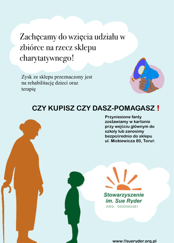Prowadzimy w szkole zbiórkę na rzecz sklepu charytatywnego na ul. Mickiewicza 80 w Toruniu .