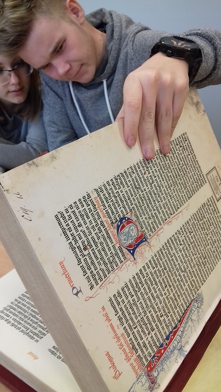 Klasa 1C była dziś na zajęciach w Książnicy Kopernikańskiej. Zobaczyliśmy faksymile (dokładne kopie) książek rękopiśmiennych i pierwszej książki drukowanej – pelplińskiego egzemplarza Biblii Gutenberga.