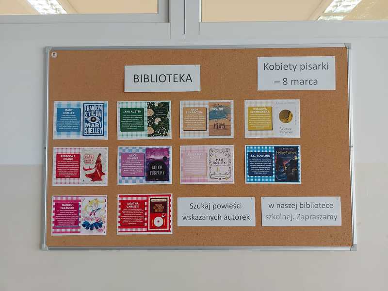 Z okazji Międzynarodowego Dnia Pisarzy i Pisarek (3 marca) oraz Dnia Kobiet (8 marca) Milena z klasy 3b przygotowała tematyczną gazetkę na tablicy informacyjnej przy bibliotece szkolnej. Prezentacja przedstawia sylwetki wybitnych autorek literatury oraz ich twórczość. Zachęcamy do zapoznania się z gazetką oraz do sięgnięcia po książki przedstawionych pisarek, które są dostępne w naszej bibliotece. To doskonała okazja, aby odkryć inspirujące historie i pogłębić swoją pasję do czytania!