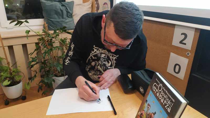 To była niepowtarzalna okazja, by usłyszeć o tajnikach pracy artysty piszącego i rysującego komiksy, jak wygląda proces pisania i jakie emocje towarzyszą autorowi podczas tworzenia swoich dzieł. Śmiechosław odpowiedział nam również jak zaczynał swoją przygodę w świecie komiksów. Wśród licznych pytań od prowadzących i słuchaczy znalazły się również te o kultowe "Opowieści grabarza". Z ogromną przyjemnością wysłuchaliśmy spojlerów dotyczących kolejnych szykowanych tomików komiksowych, które to poruszy serca czytelników. Zwięczeniem spotkania była krótka część warsztatowa podczas, której uczestnicy spotkania autorskiego mogli spróbować swoich sił w szkicowaniu postaci komiksowej. Na sam koniec nie zabrakło długiej kolejki po fantastycznie narysowane autografy!