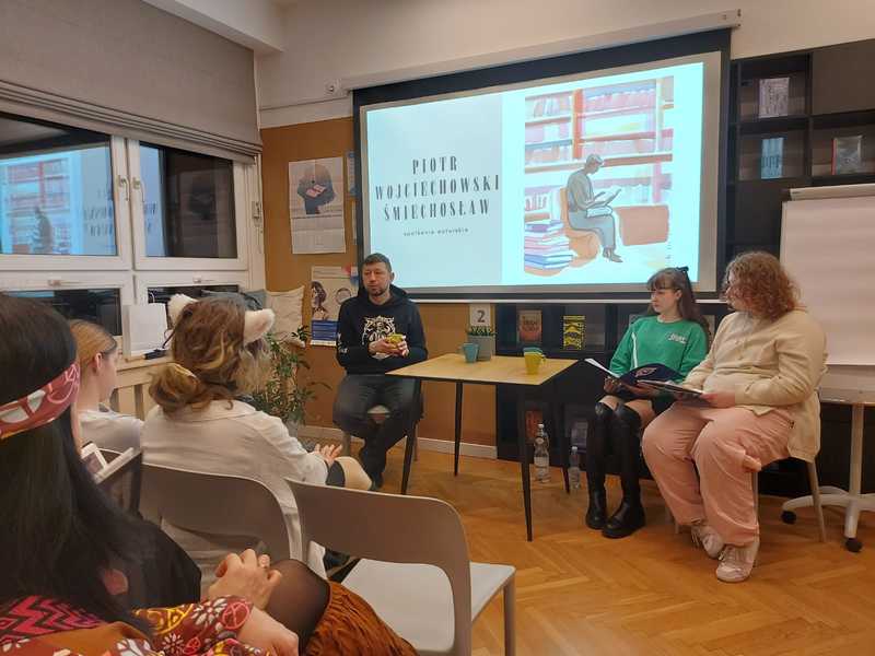 Śmiechosław - Piotr Wojciechowski - znakomity twórca komiksów gościł u nas wczoraj w bibliotece w ramach Bajkowego Wieczoru organizowanego w naszej szkole.