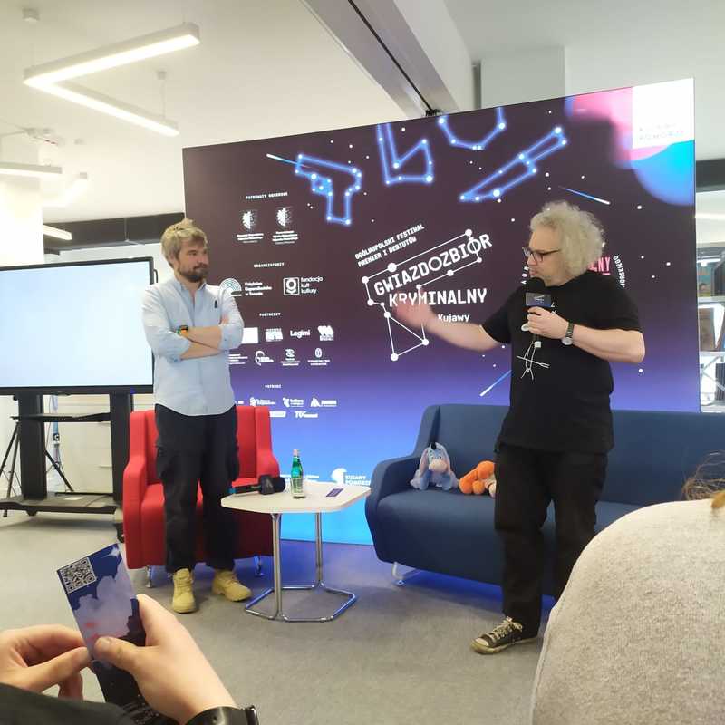 Wczoraj w Mediatece w Młynach Kultury prawie setka naszych uczniów uczestniczyła w spotkaniu warsztatowym z pisarzem Zygmuntem Miłoszewskim w ramach Ogólnopolskiego Festiwalu Premier i Debiutów Gwiazdozbiór Kryminalny. Zygmunt Miłosewski na kilku przykładach postaci historycznych i literackich (np. Shreka czy Froda Bagginsa) przedstawił uczniom schemat budowy fabuły mistrzowskich utworów. Uczniowie mieli okazję poznać p. Zygmunta i jego bogatą twórczość. Nie zabrakło wspólnego zdjęcia oraz autografów.