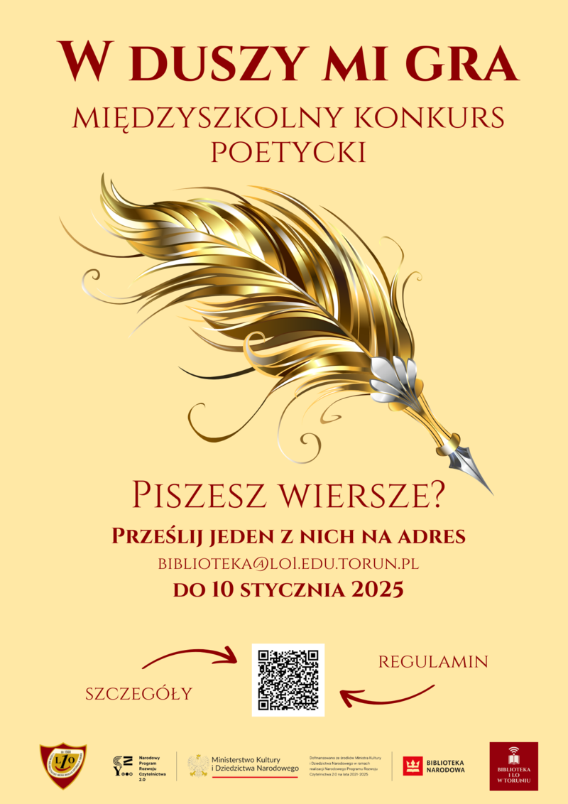 Konkurs realizowany jest w ramach NPRCz 2.0 przez zaprzyjaźnioną bibliotekę szkolną 1 LO w Toruniu.