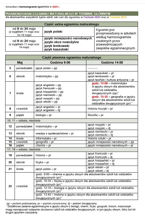 Zgodnie z Komunikat dyrektora Centralnej Komisji Egzaminacyjnej z 20 sierpnia 2024 r. w sprawie harmonogramu przeprowadzania egzaminu ósmoklasisty oraz egzaminu maturalnego w 2025 roku, egzaminy maturalne w 2025 roku odbędą się w DWÓCH FORMUŁACH: FORMUŁA 2015 i FORMUŁA2023 w nastepujących terminach: