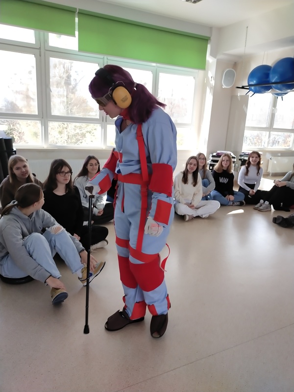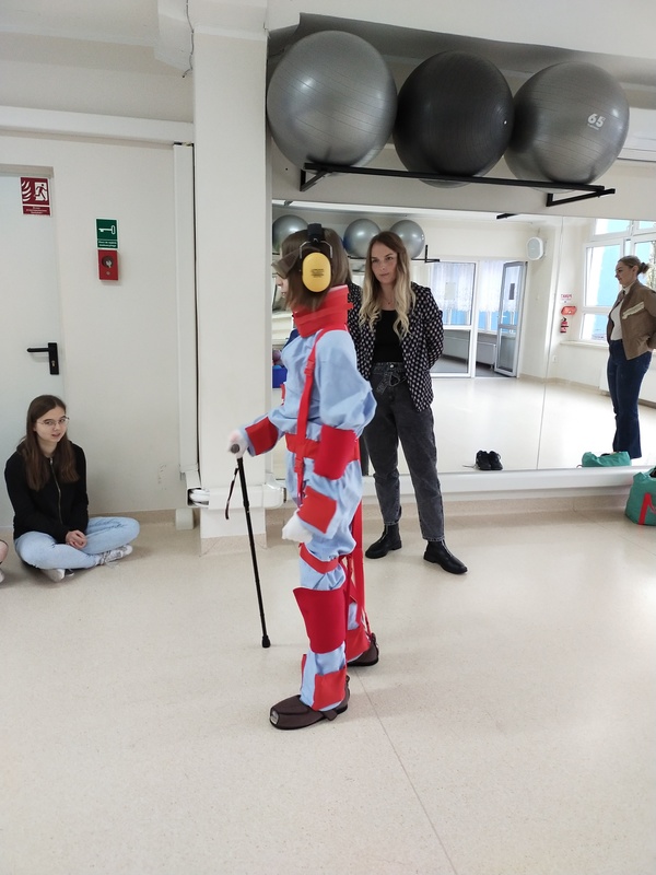 Uzupełnieniem spotkania była prezentacja kombinezonów geriatrycznych, w których, dzięki odpowiedniej symulacji uczestnicy mogli funkcjonować przez kilka chwil jako osoby starsze.